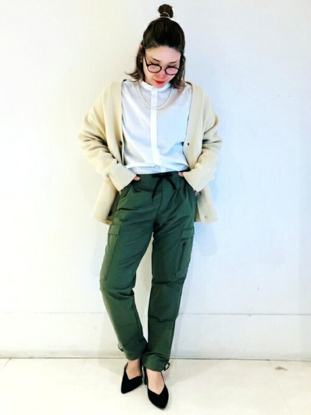 久々にランチ会な日はちょっぴりおしゃれに☆ キチンと感なシャツに、カーゴパンツとメンズのカーディガンで抜け感を。 オーバーサイズなカーディガンはユニセックスに着れて人気なアイテムです。 【Gapストア ダイエー大宮店 / Sato】