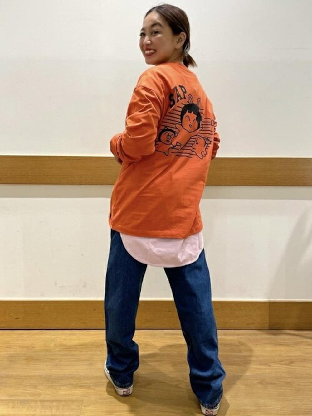 152cm 可愛いバックスタイルでインパクトのあるデザインの長袖Tシャツ♡ しっかりレイヤリングして、裾からチラッと見えるTシャツがまたオシャレ度up!! 【Gapストア イオンモール浦和美園店 / Kikuchi】
