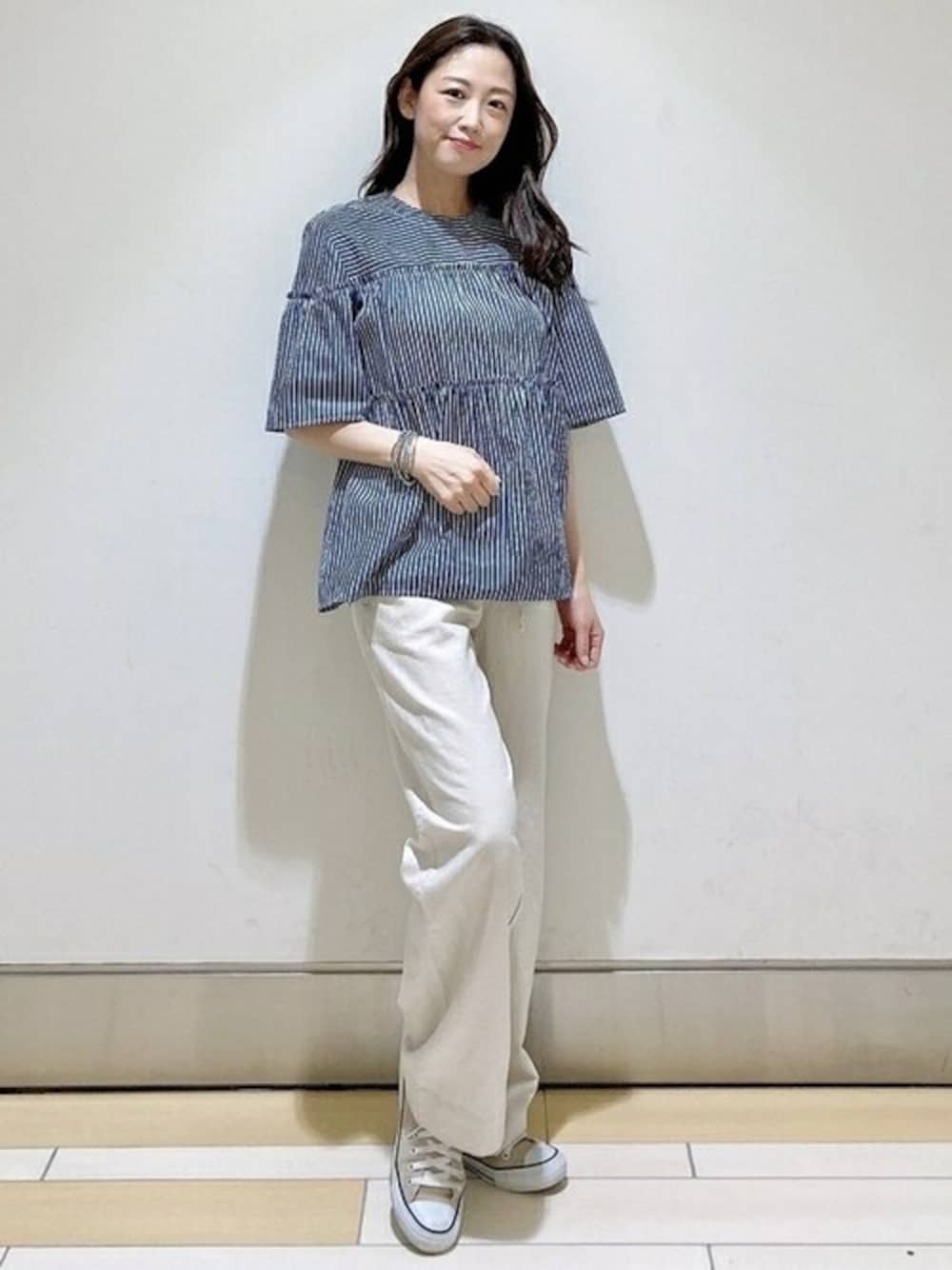 161cm 【華やぎティアードブラウス人気カラー】 ティアードトップス、今季の新柄、ネイビー✖️白のストライプ柄です。 甘辛MIXな雰囲気で、大人の方にも人気です。 お色違いもございます! リネンのワイドパンツと合わせて涼しくいかがですか? 【着用サイズ】 トップス:XS パンツ :XS 【Gapストア 国分寺マルイ店 / Ito】