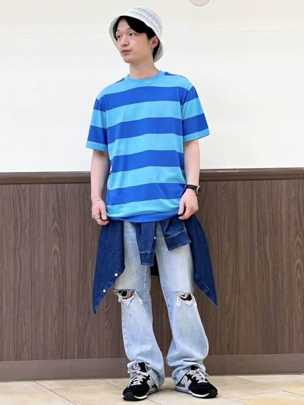 【サマーカラーコーデ】 ブルー系で合わせ色の濃淡で遊んだコーディネートです! スタイルアップ効果を狙い、シャツはウエストラインで巻きTシャツもジャストサイズで着丈が長過ぎないよう選んでいます。 ポイントのハットはパートナーとお揃いで合わせても素敵ですよ♪ 【Gapストア イオンモール浜松志都呂店 / Youhei】 【スタッフ着用サイズ】 デニムシャツ:M Tシャツ:M デニム:29×30