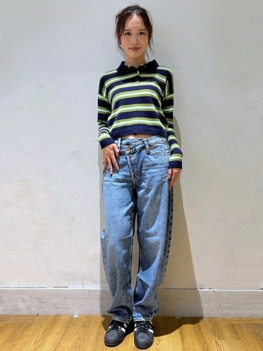 旬なポロセーター×デニム 襟付きの上品さとニットの風合いで、 Tシャツよりきちんと見せてくれる旬アイテムがポロニットです。 ウエストのアシンメトリーなデザインが目を引く デニムは、脚のラインが強調されない、 程よい太さが着回し度高めです。 【スタッフ着用サイズ】身長172cm ポロニット S デニム 28 靴 私物 【Gapストア ららぽーと横浜店 / Okafuku】