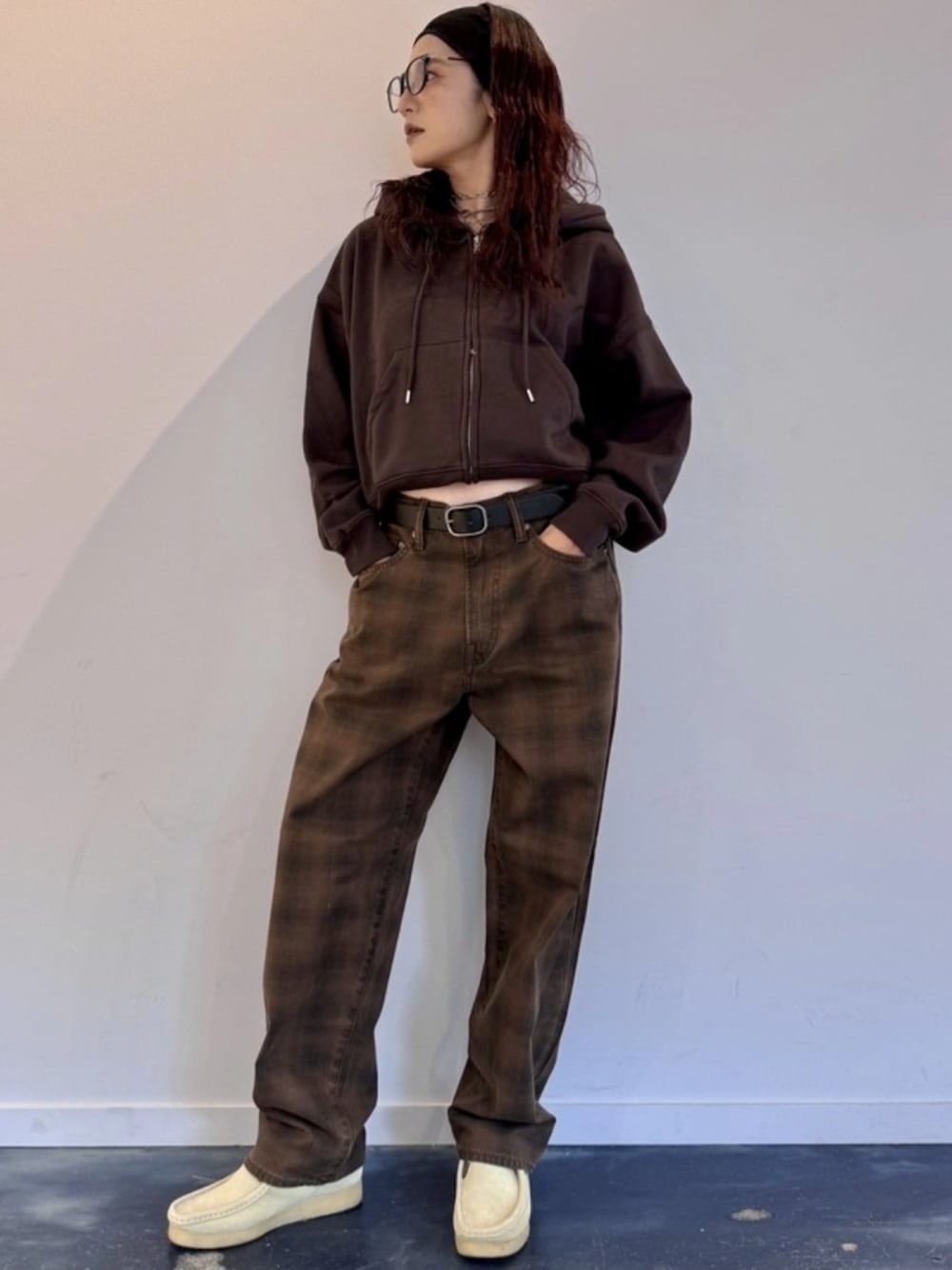 Allブラウンコーデはトレンドのカラー! 更に短めの丈のフードは羽織りにインナーに着回しできるアイテム!着心地も◎ 【スタッフ着用サイズ】身長157cm tops xs pants 2930 ベルト s 【Gapストア 新宿フラッグス店 / Yura】