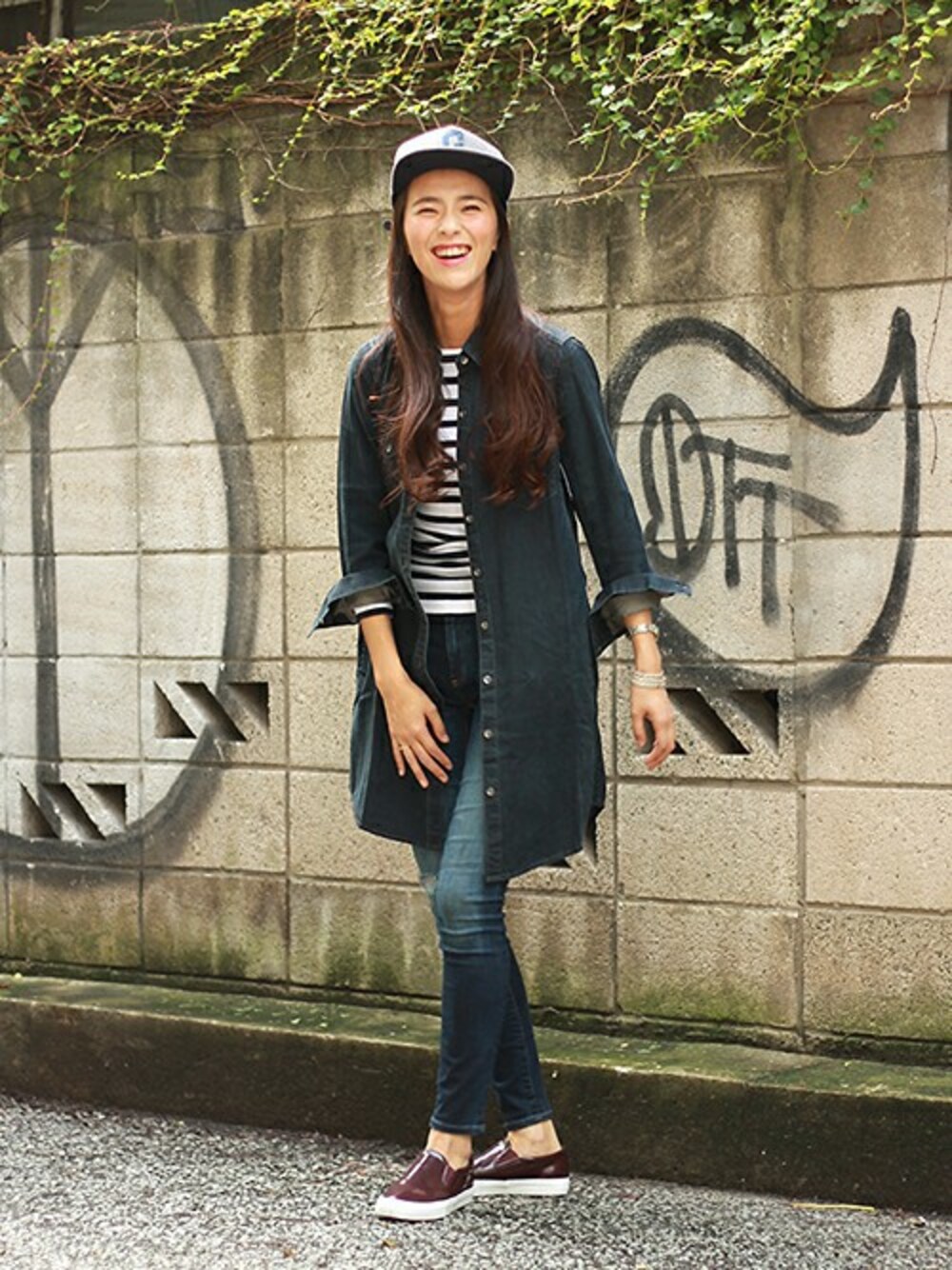 デニムONデニムを今年らしく着こなすならロング丈のトップスをセレクト。ビッグシルエットが逆に女性らしさをアップ。フェイクレザーのスリッポンでひきしめて。 デニムシャツワンピース (Color:インディゴ/¥8,900/ID:110123/着用サイズ:XS) ロングスリーブTシャツ (Color:ホワイト×ネイビー/¥2,400/ID:534439/着用サイズ:XXS) スキニーデニム (Color:ダークインディゴ/¥9,900/ID:109504/着用サイズ:23) スリッポン (Color:バーガンディー/¥5,900/ID:109616/着用サイズ:7) キャップ (Color:グレー/¥2,900/ID:110184) その他:参考商品 スタッフ身長:167cm >フラッグシップ原宿 http://mobile.gap.co.jp/stores/sp/store.php?shopId=37533953 >オンラインストアはこちら http://www.gap.co.jp/browse/subDivision.do?cid=5643 >GapストアスタッフコーデをWEARで見る(Women) http://wear.jp/gapjapan/ >GapストアスタッフコーデをWEARで見る(Men) http://wear.jp/gapjapanmen/