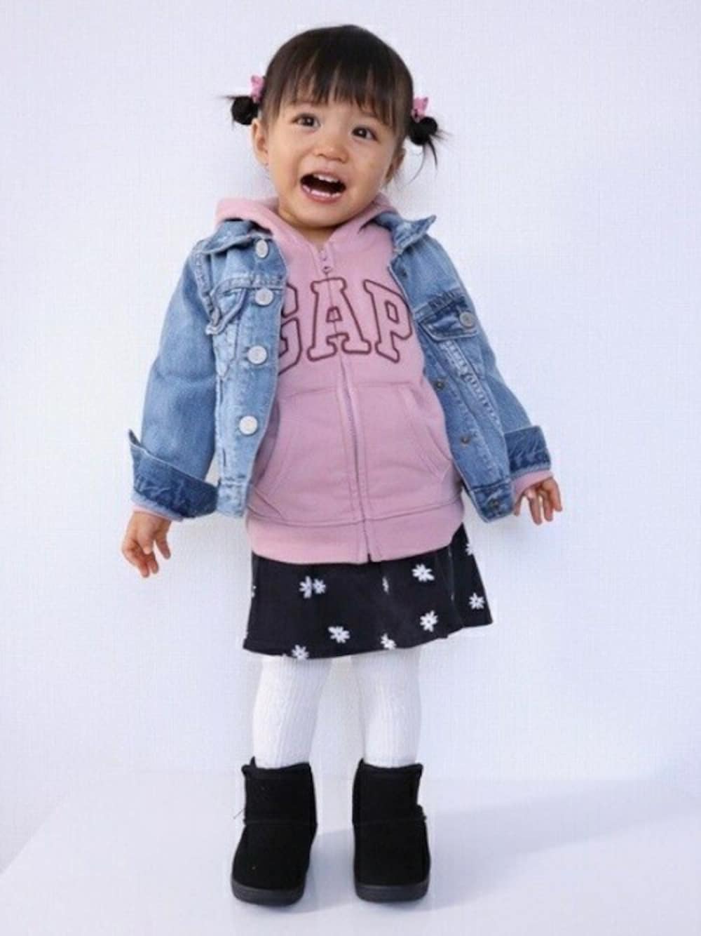 デニム×GAPロゴでガーリーコーデ 柔らかいデニムで着せやすくダメージ加工も大人顔負け! 後ろから見えるパーカーの耳もとってもキュート♡ スカートはインナーパンツ付きなのでとってもオススメです! 【82cm / Gap公式キッズ&ベビーモデル / Yua】