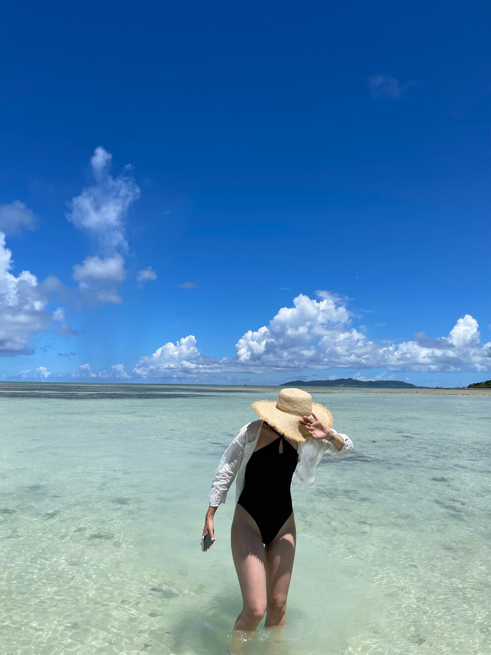 ホワイト系のその他アウター、ブラウン系の水着、ベージュ系のハットを着用したレディースの夏コーディネートの1枚目の写真
