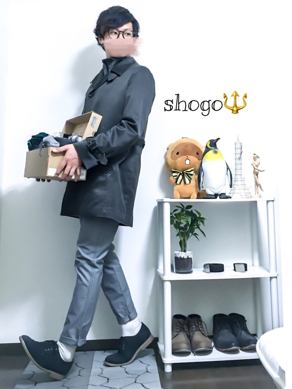 みなさんおはこんにちばんわ! ダサ男のshogo🔱です! 昨日の夜に部屋の片づけをしてる途中に撮りました! ちなみに持ってるのはマフラー入れた箱です♪( ´▽`) サイズ コート:46 ニット:46 パンツ:S シューズ:S いいね、お気に入り下さる方ありがとうございます!