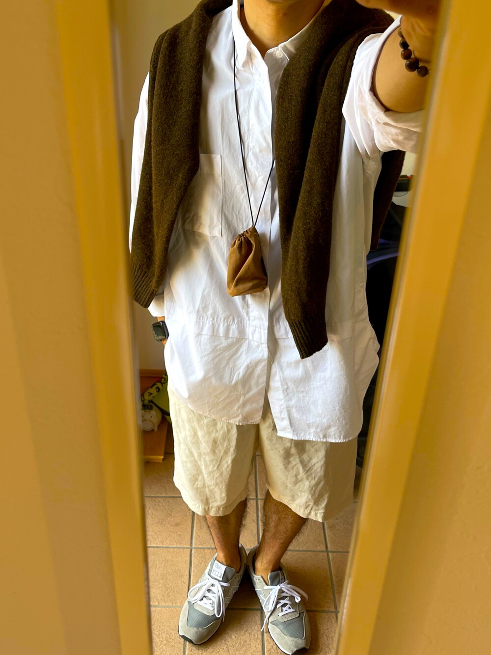 秋コーデ。(全部UNIQLO) 白をベースに茶色のニット、ミニポーチをぷらす。 靴も茶色の革靴にしようと思ったけど、今日はfamily dayで動き回るのでスニーカーで外しました。 白シャツとニットの肩がけで大人っぽいから、外すことでバランスキープ。 キャップ被りたいけど持ってない(涙)