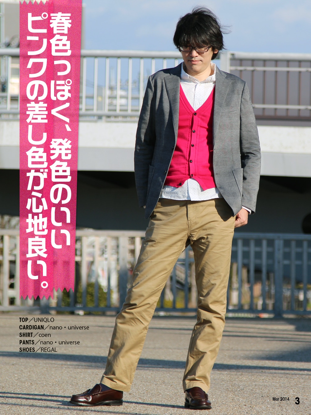 春っぽく差し色に発色の良いピンクを使いました。 ジャケットはユニクロのグレンチェックのもの。 超大型店(ユニクロ 銀座店とか)しか売ってないみたい。 ゆるくも無く固くも無く、程良い感じが心地良いのです。 ドライシリーズなので初夏まで着れるかな?