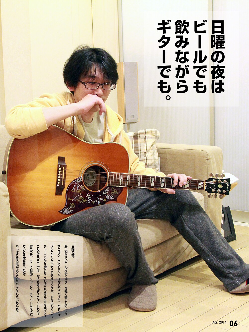 日曜の夜はビール片手にギターでも弾きながらゆっくりと。 コーデは気負うこと無く、湯上がりのスウェットスタイルで楽ちんです。 今夜は冷えるから起毛Tシャツで暖かーい。 なんの参考にもならんでスイマセン!☆ ギターはGibsonのHummingbirdです。