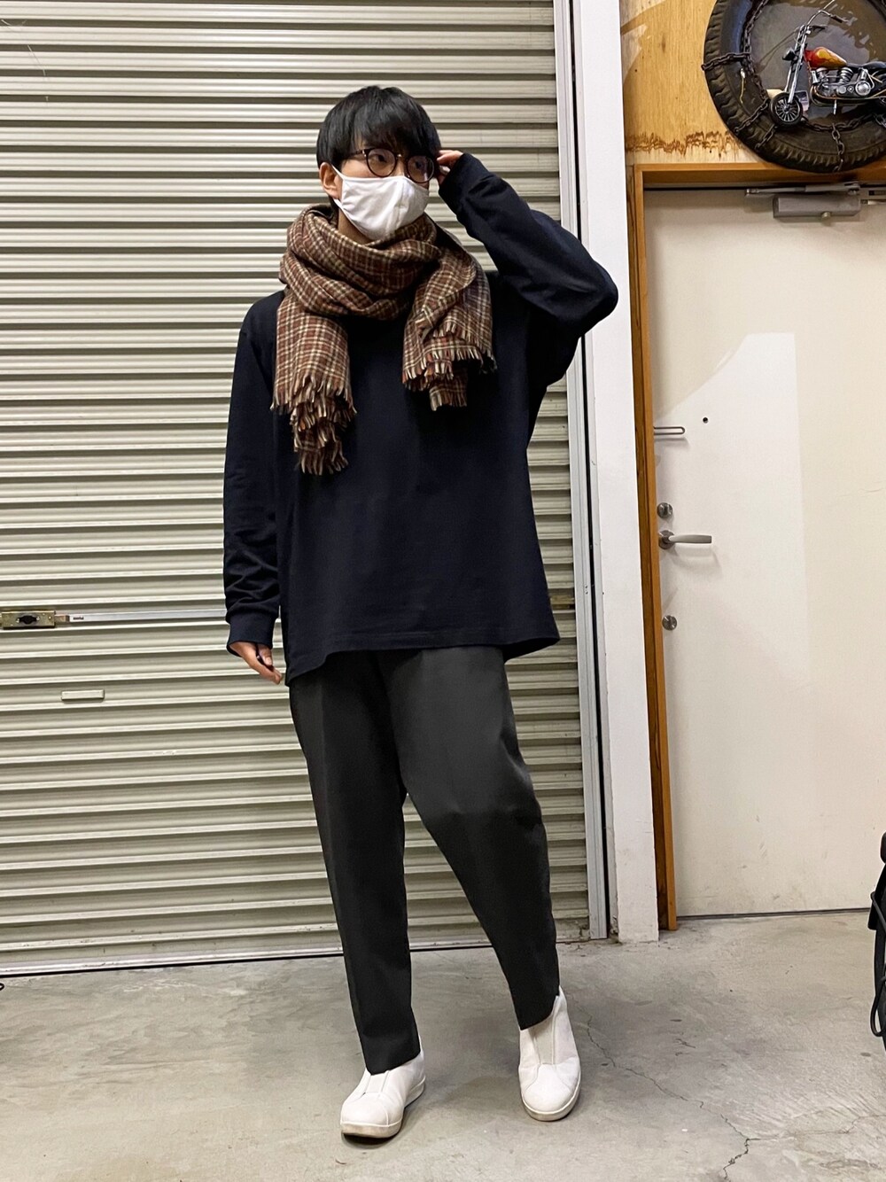 服がほぼ真っ黒でも地味にならないように工夫したコーディネート。 柄ストールと白スニーカーで、地味な印象を無くしました。 最近は昼間は暑くてTシャツとかスウェット1枚でいいですが、夜は少し冷え込みますね。 夜はストール巻いて、昼はTシャツで過ごしてます。
