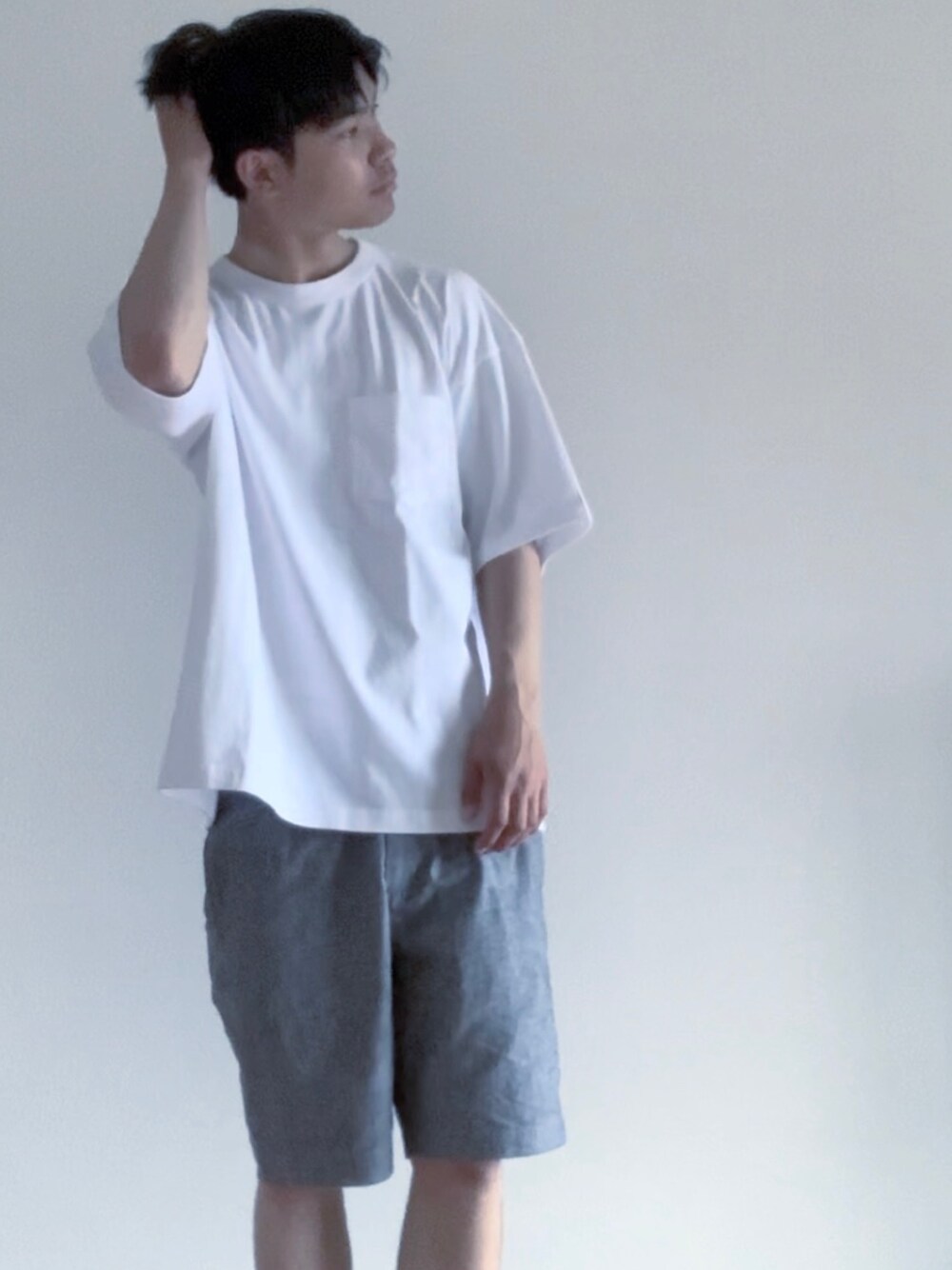 ホワイト系のトップスを着用したメンズの夏コーディネートの1枚目の写真
