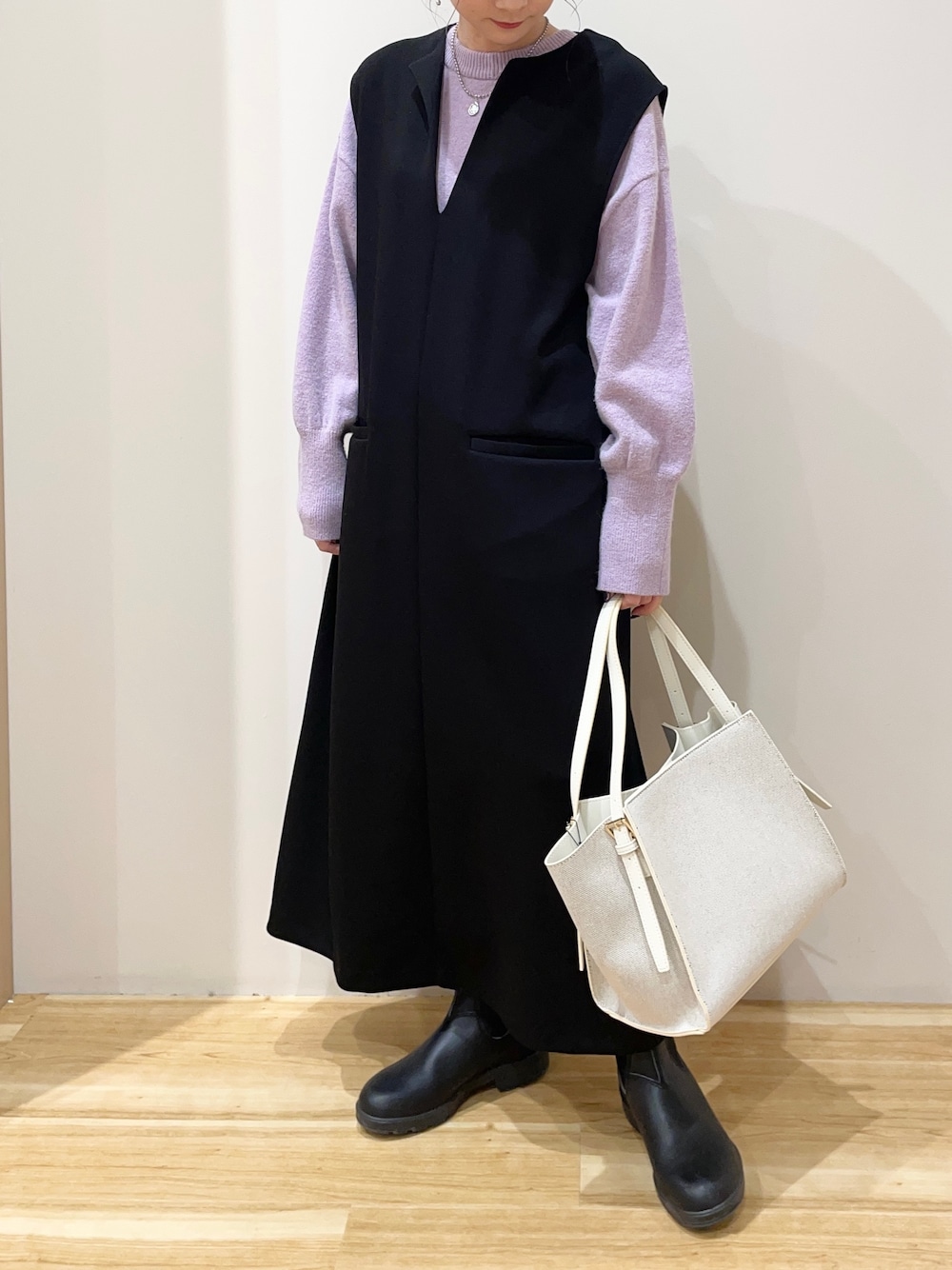 着心地抜群のキーネックジャンスカ! コーディネートに迷った日の味方です^ ^ 綺麗目にもカジュアルにも合うので 様々なシチュエーションで大活躍間違いなしです! 明るめのパープルニットをインナーにした オンタイムでおすすめなスタイリング 是非お試しくださいませ♪