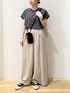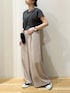 シンプルなモノトーンコーディネート! ボトムスには ワイドなシルエットが素敵なスカーチョを◎ タックが入っているので、トップスをインすると 腰回りがすっきり見えて バランス良く着用頂けますよ! 是非お試しくださいませ^ ^