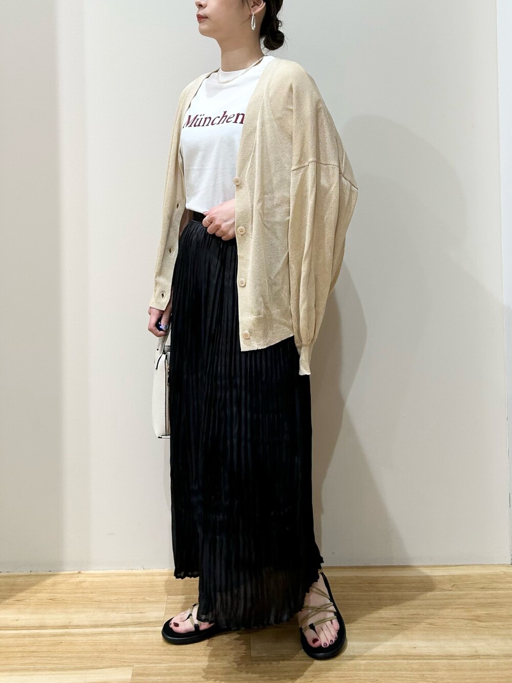 おすすめママコーデ^ ^ シャイニープリーツスカートは 広がりすぎないシルエットなので上品に すっきり着用できるアイテム! 今回はロゴTeeを合わせカジュアルダウン、 是非お試しくださいませ♪