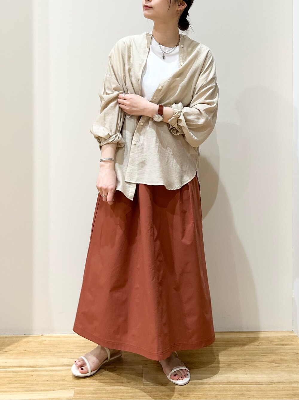 シルエット、長さ共におすすめな Aラインのタックスカート^ ^ やや光沢感もあるので綺麗目にもカジュアルにも 合わせやすいアイテムです! シアー素材のシャツはこの時期に羽織っても 重たく見えないので便利ですよ◎ 是非合わせてGETされてくださいね!