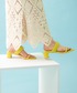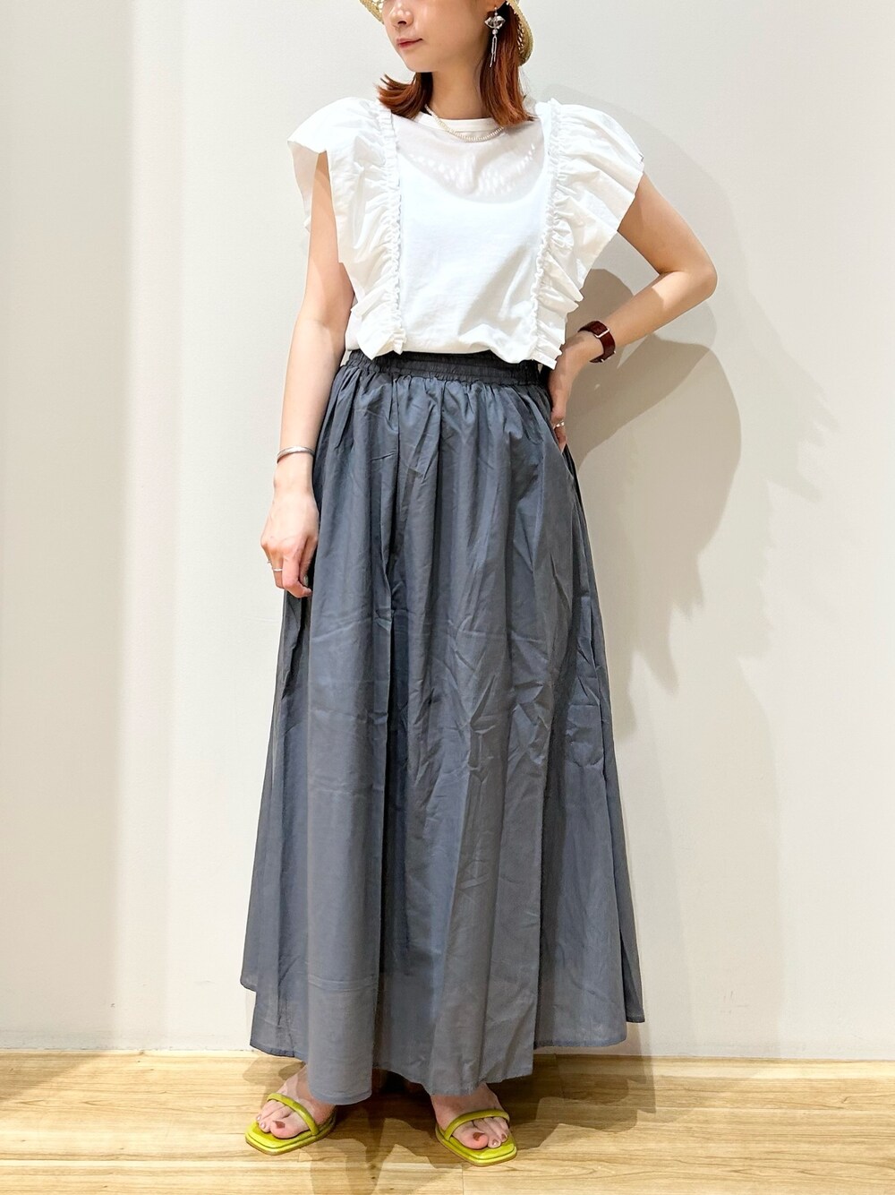 ブラウス見えする、コットン100%のアイテム! お袖のラッフルデザインが可愛く 腕周りのカバーもしてくれます◎ シンプルな組み合わせですが イエローカラーのサンダルでアクセント♪ ダブルストラップで安定感もあり 履き心地抜群です! 是非合わせてGETされてください^ ^