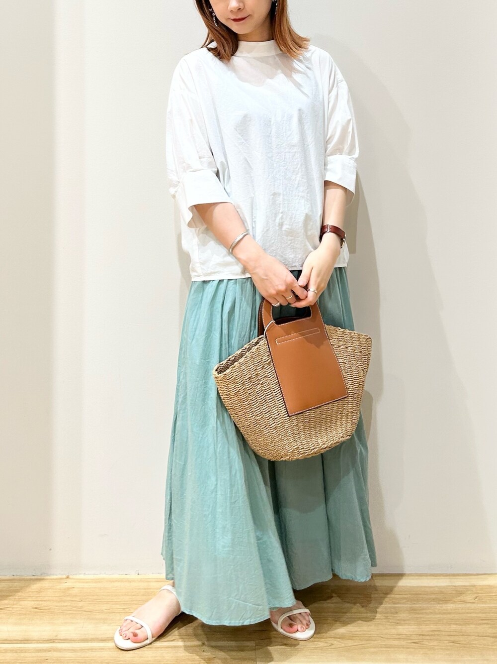 夏のおすすめママコーデです^ ^ 二の腕がしっかりカバーできる5分袖で シンプルなデザインの中にも 拘りの詰まった一枚です♪ 着丈も長すぎないので スカート合わせでもすっきり見え◎ ミントカラーのスカートで爽やかに! 是非お試しくださいませ。
