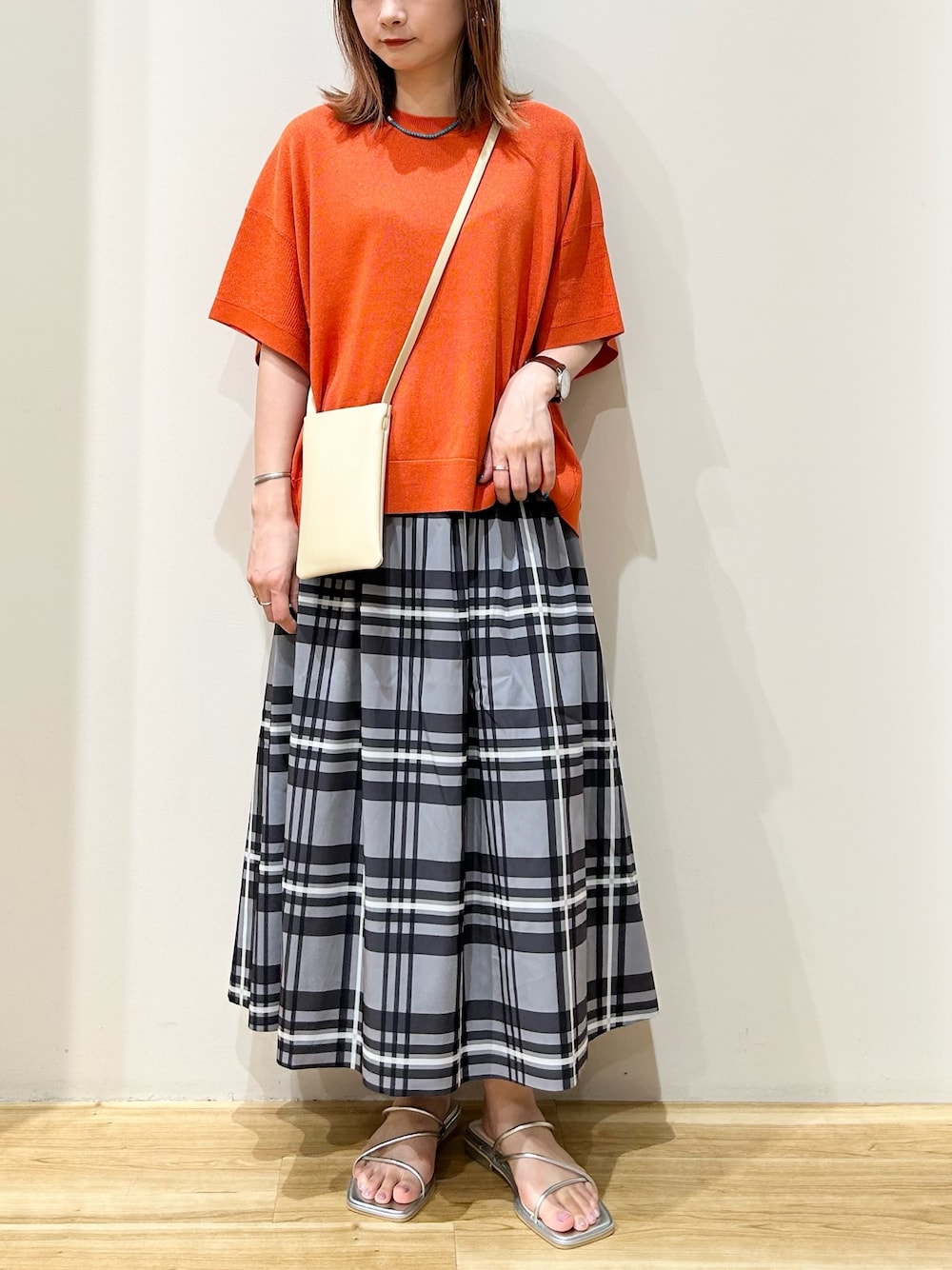 オレンジのハーフスリーブニットに チェックスカートを合わせました^ ^ チェックと無地のリバーシブルで お使いいただけるスカートは カラーも落ち着いた配色なので着回しやすい おすすめアイテムです♪ 是非GETされてください!