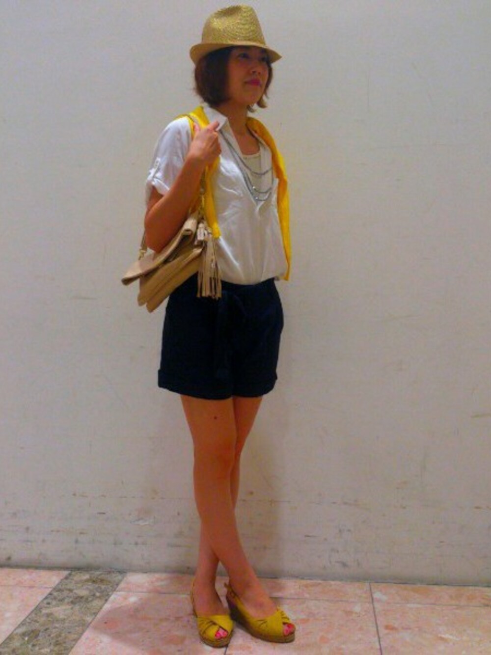 ベーシックな白ブラウスはネイビーのパンツとの相性がバッチリ♪ さらに小物をうまく取り入れると、一気におしゃれ度がアップします!