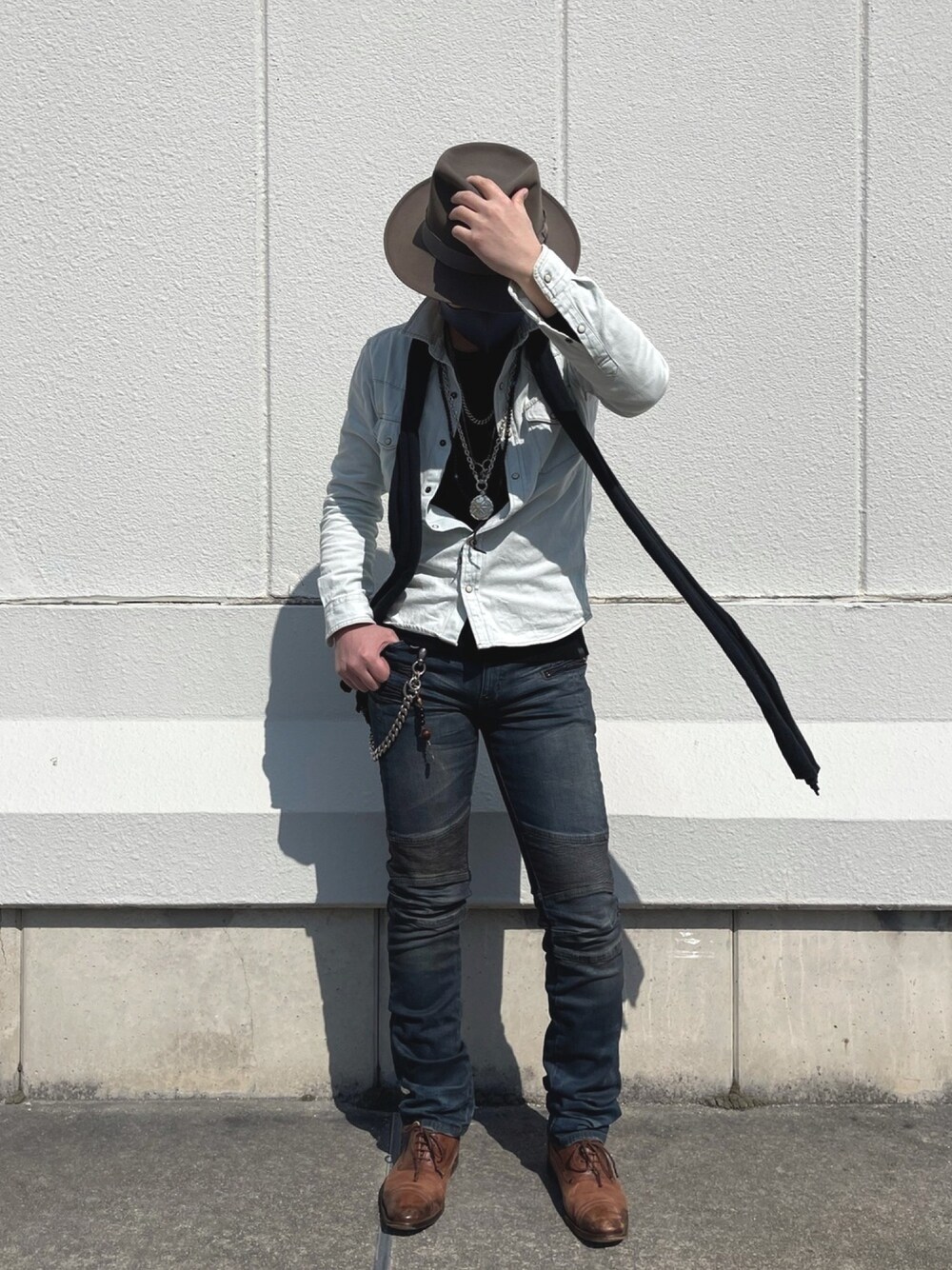 デニムシャツジャケット✖️バイカーデニムのコー デ✨ストール🧣がポイントになっています。 デニムオンデニムはポイントポイントの色の統一感 が絶対不可欠。ご参考までに。