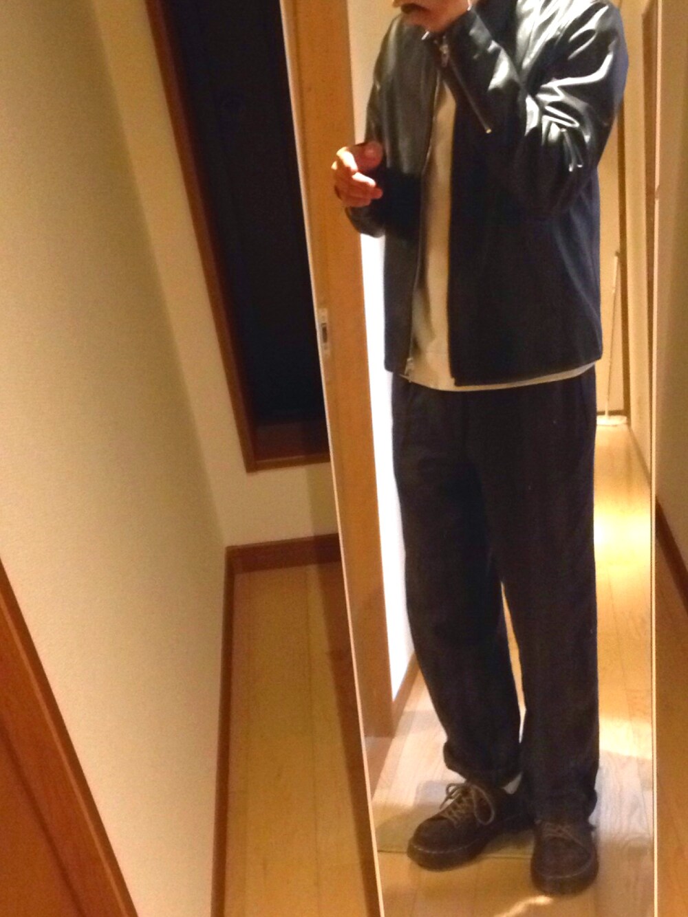 アウターはレザーのジャケットで男らしく、ハードな感じにしてみました。 インナーは白のタートルネックでアウターの差し色として入れてみました。 ボトムスはトップスのビシッとしたコーデを中和するように暗めのワイドパンツを履いてます。 シンプルになりすぎないようにボトムスには若干のチェックが入っており、小さなオシャレ感を出しています。😁😁😁