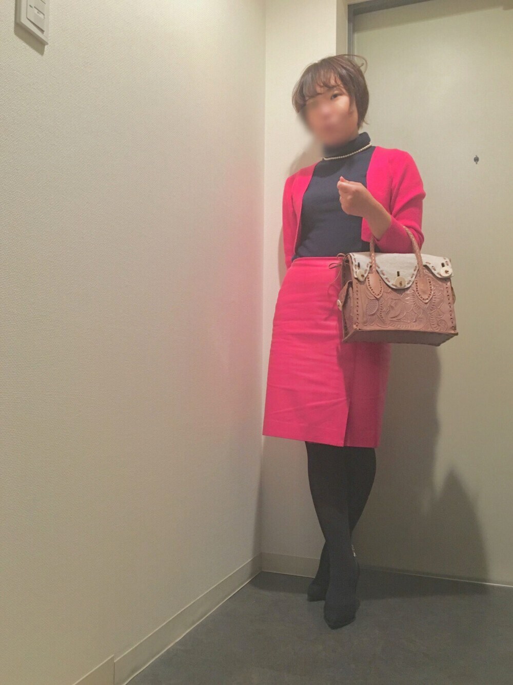 骨格ストレート意識強いコーデです。 ストレートタイプお得意の#スムースレザー のタイトスカートが一番のポイントです^^ カーディガンが苦手なんだけど、toccaのこんな#スクエアカーディガン なら縦のIラインがでて、まぁいいんじゃない?くらいにはなれたかなと。 セットアップ みたいなコーデになったな笑。 グレースコンチネンタルのカービングバッグはなんとフラップと後ろがハラコ!! ゴージャス な雰囲気と可愛いらしさの共存が素敵な一品✨👌