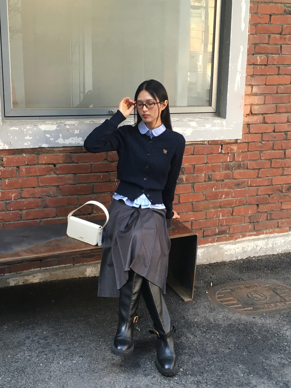 ブルー系のカーディガン/ボレロを着用したレディースの秋コーディネートの1枚目の写真