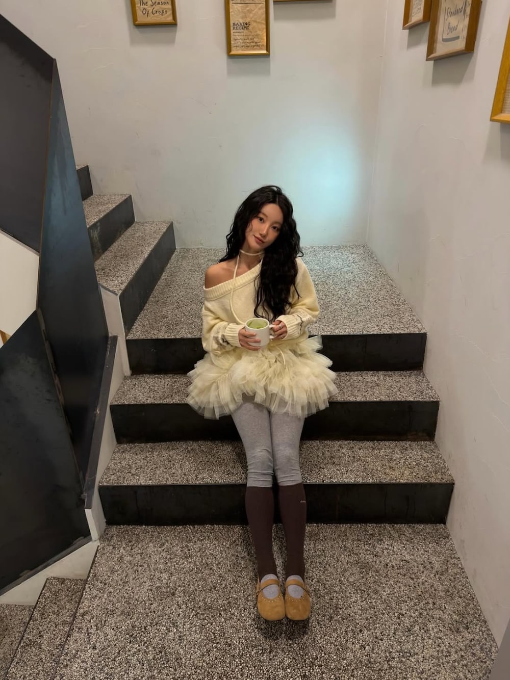オフショルにも着ることができるニット。今流行りの紐も巻いて女性らしさアップ