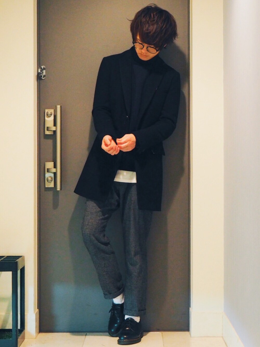 黒のチェスターコートにネイビーのニット合わせた👯 パンツもワイドとまでいかないまでも細身じゃないタックパンツ選んでみた👯 個人的に結構お気に入りのコーデ👯 伊達眼鏡2日目にして顔と結合し始めてきたよ👯 《サイズ》 coat:2 knit:S inner:M pants:S(裾上げしてます) Instagram⇨【acdc_gk】 Twitter⇨【tyaaahaaan】 良かったら覗いてみてください💃 それと素敵な木のおもちゃも作ってます💃 じゃあʕ•ᴥ•ʔ