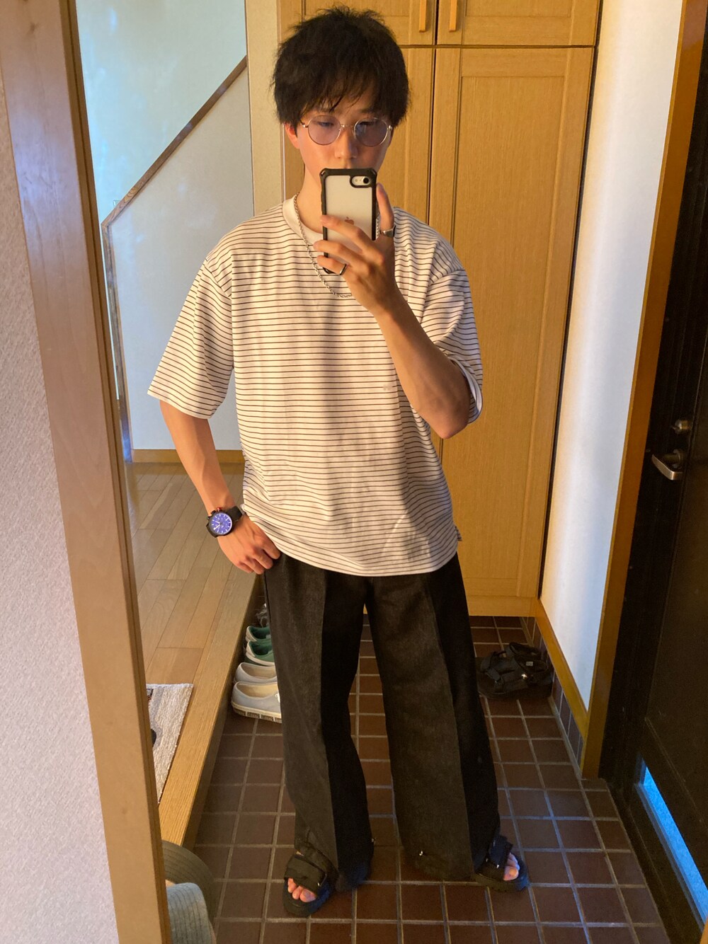 動画や記事を参考にコーデを組みました。 タイトルの通りADRERのフレアデニムがかっこいいのでそこがポイントです! 個人的にボーダーのシャツとネックレスはあまり相性がいいとは思わないのですが皆さんはどうでしょうか? そこを含めてアドバイスやコメント等があればお願いします(*^^*)