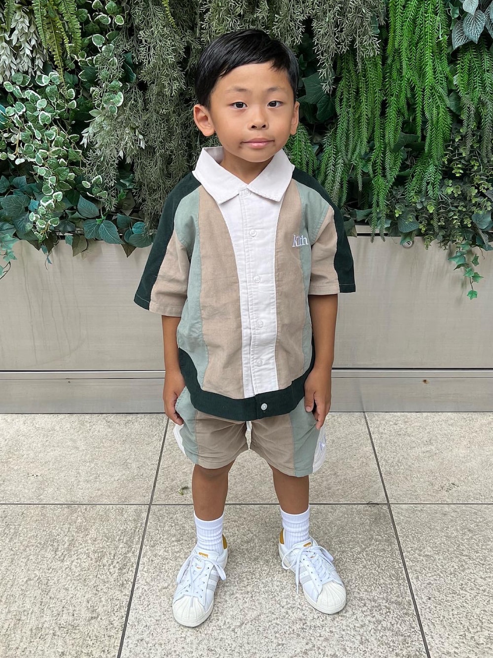 グリーン系のシャツ/ブラウス、グリーン系のその他パンツ、ホワイト系のスニーカーを着用したキッズの夏コーディネートの1枚目の写真