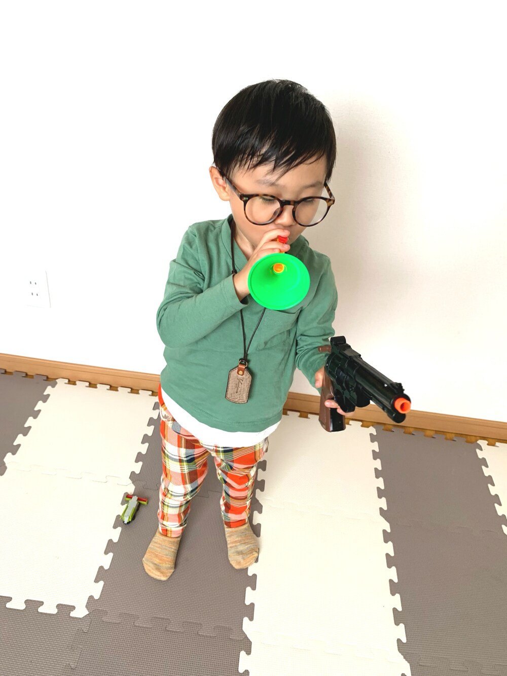 いつもご覧頂きありがとうございます♡ いいね、お気に入り、フォロー、フォルダインもありがとうございます♡ 本当に嬉しいです(*´-`) 2歳息子のコーデです。 今日はブリーズのチェックパンツで。 トップスは西松屋さんの重ね着風ロンTです。 今日はなんだか欲張りの息子。 おもちゃ二つ使いです。 ラッパを朝から「ぷっぷゥ〜!!」 苦情来そうです。