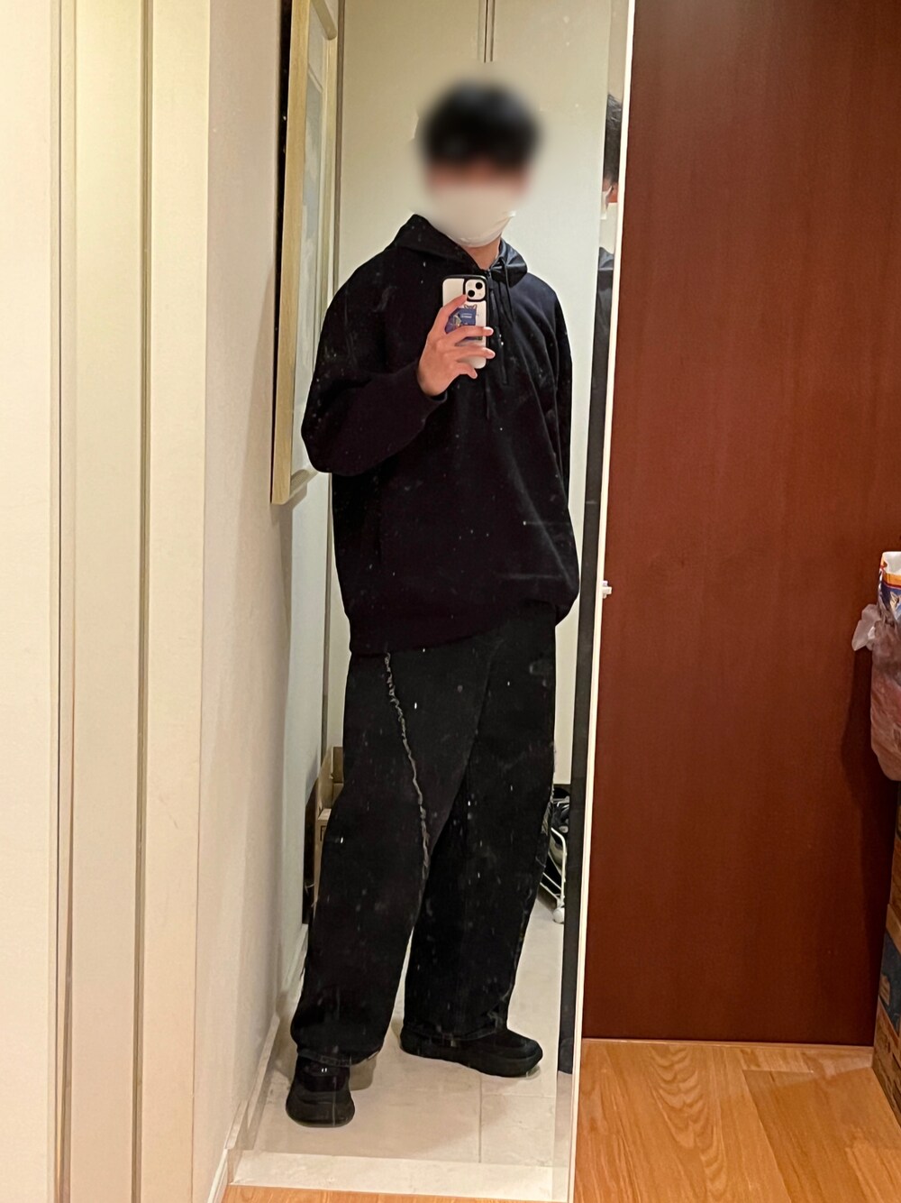 全身黒コーデ +jの切り替えのパーカーにジエダのデニム👍 それにしても鏡()