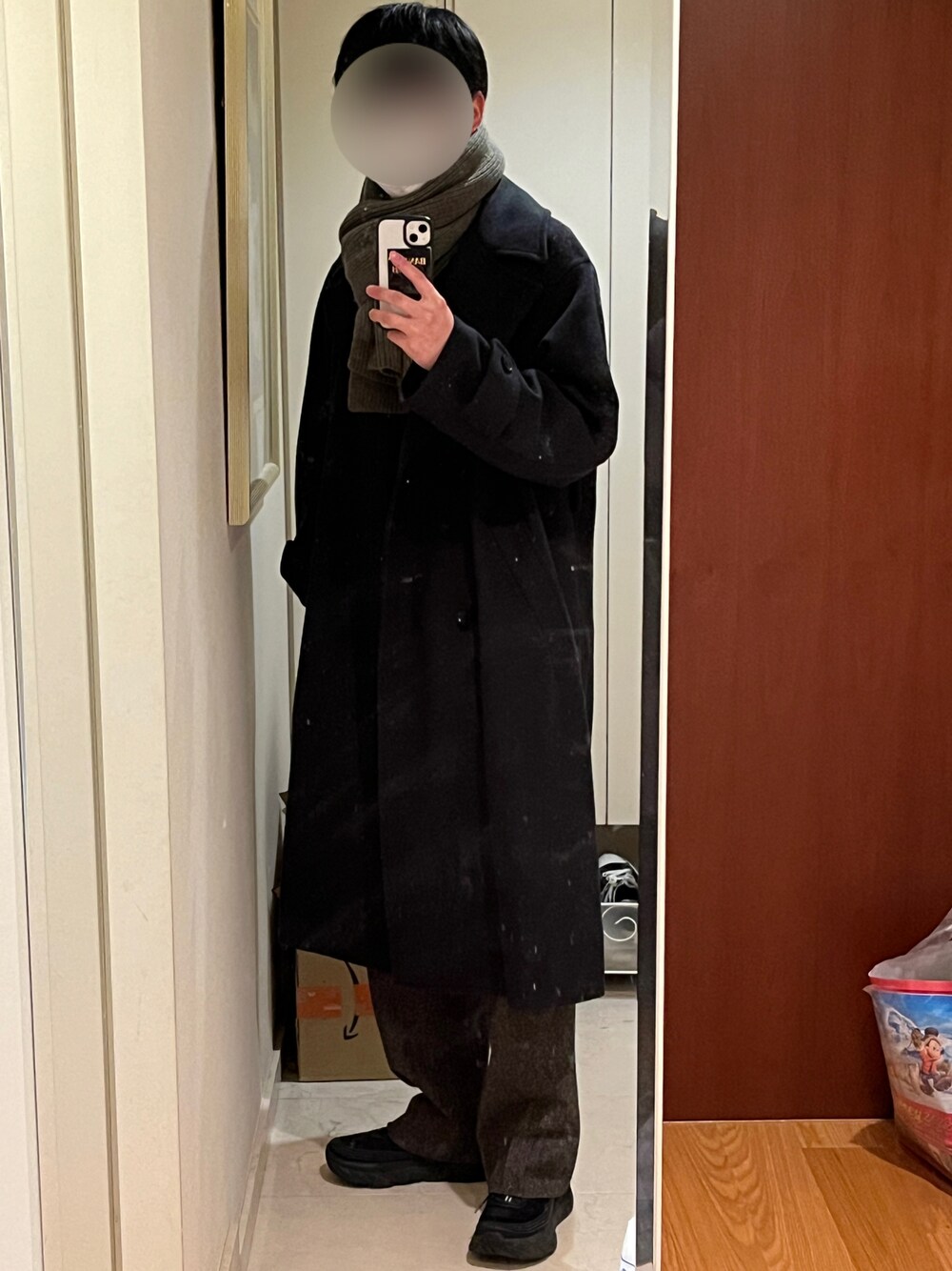 相変わらず鏡の汚さ、冬は脳死ロングコート