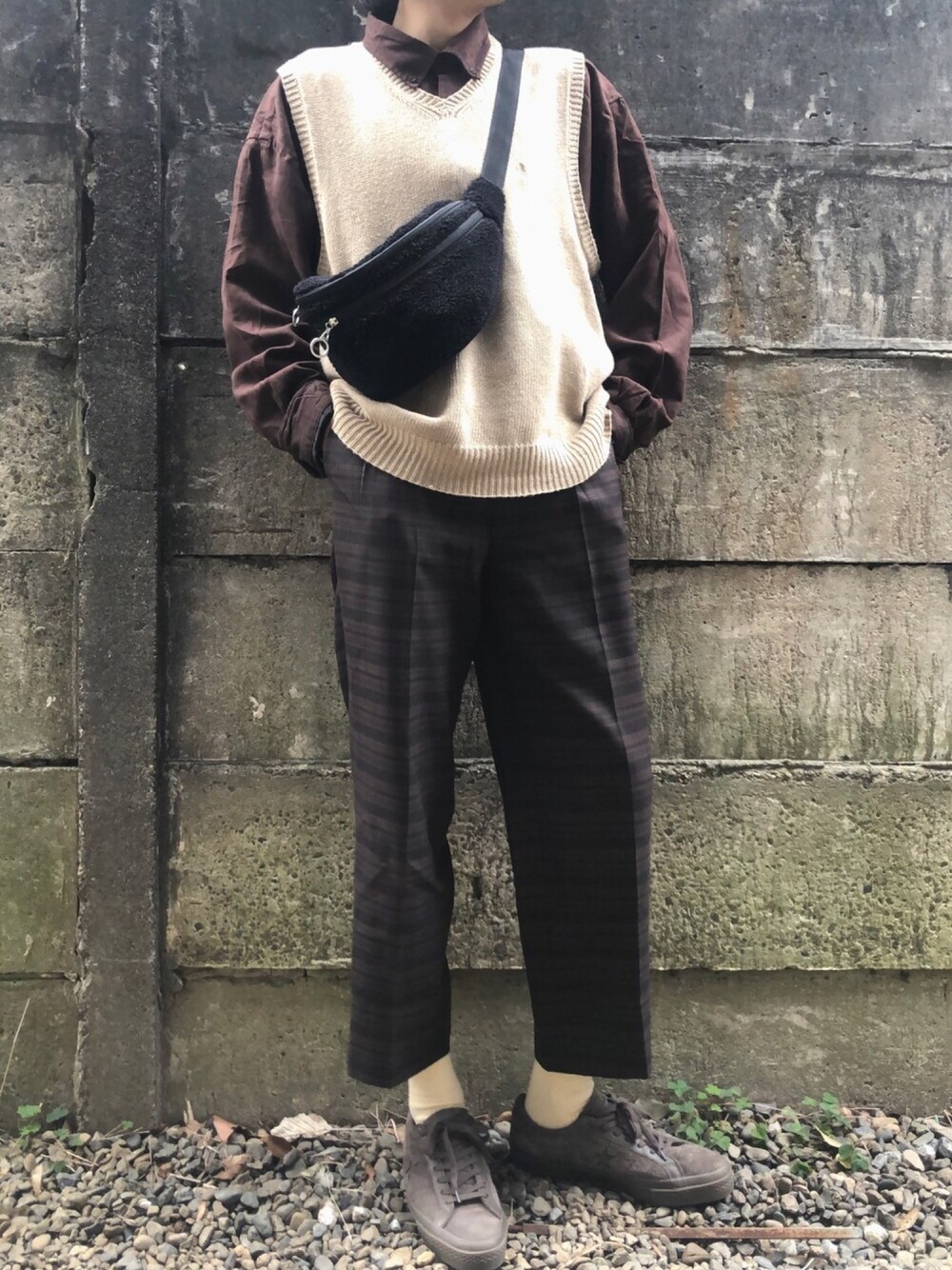 USEDシャツ USEDラルフニットベスト USEDチェックパンツ UNIQLO靴下 CONVERSEスニーカー WEGOバッグ