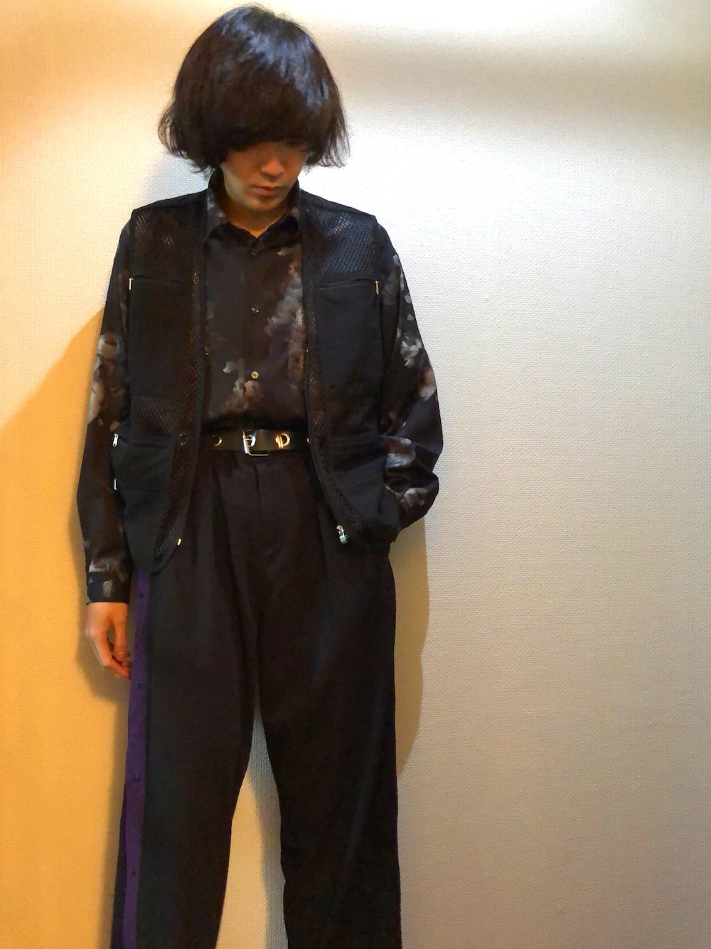 ブラック系のパンツを着用したメンズの春コーディネートの1枚目の写真