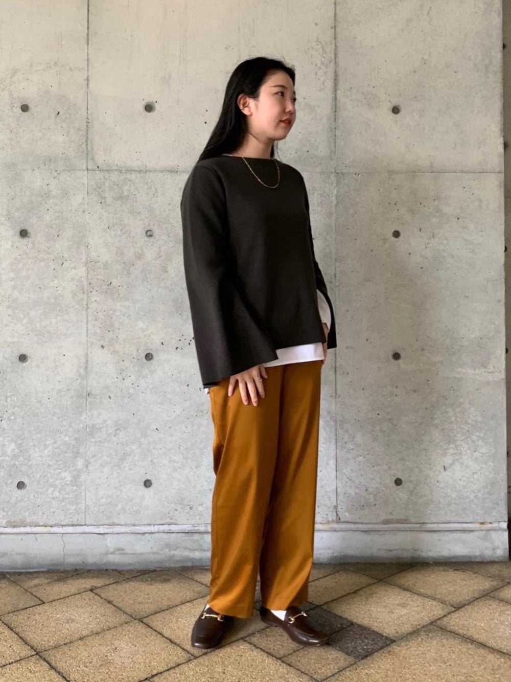 ニットはレイヤードスタイルがおすすめです。 定番の白黒以外にも、色物を中に着ても可愛いと思います。 パンツはほどよい光沢感があり、伸縮性が効いていて履き心地が抜群です。 ローファーは革が柔らかくとても履きやすいです。