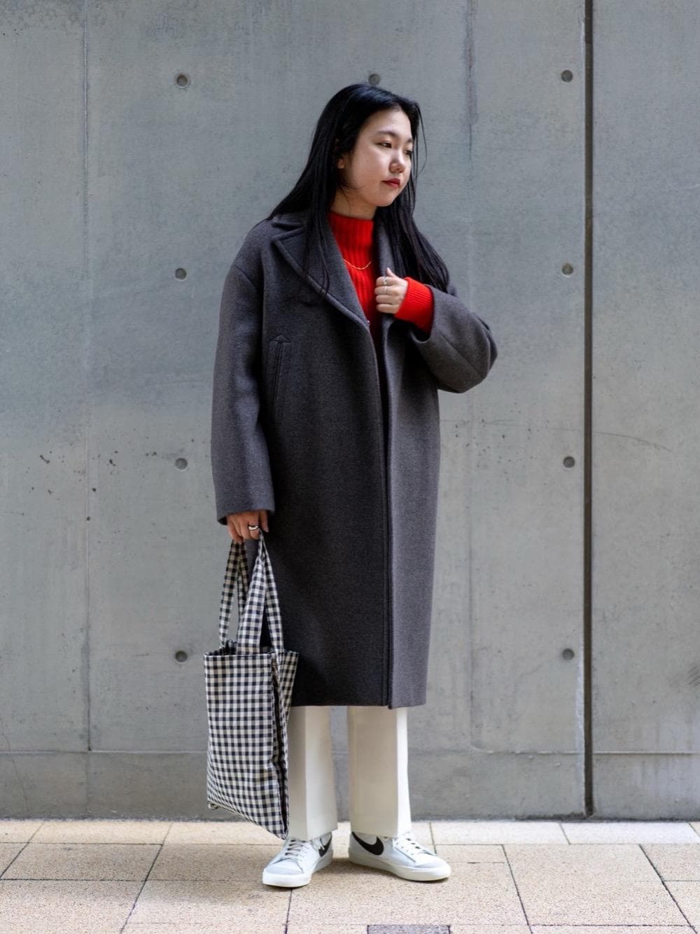 ダークトーンになりがちな冬の装いのイメージを一変させるオレンジニットとホワイトパンツの組み合わせに、落ち着いたカラーのアウターを合わせてまとめました。 スニーカーは国内EXCLUSIVEモデルでレトロなデザインと配色が可愛いです。