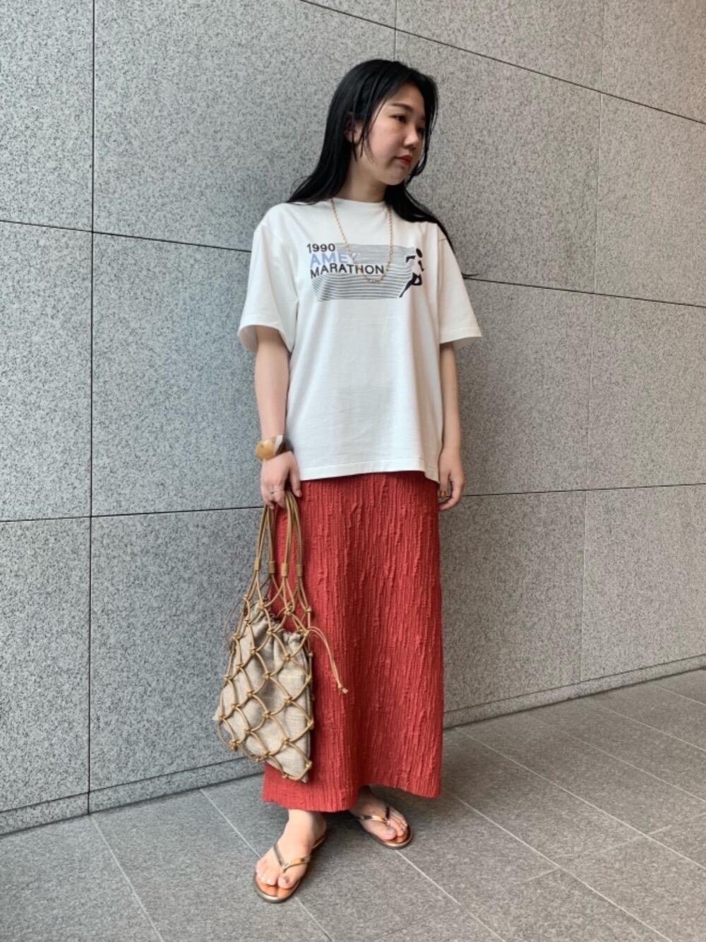身長162cm 普段サイズ アウターMorL/ボトムスMorL/シューズ24.5cm 【サイズ感】 スカート:標準。ウエストゴムで着心地が楽です。 【素材感・着心地】 スカート:ポリエステル素材で、サラッとした着心地です。シンプルな形ながらも、ジャカード地の凸凹した風合いがコーディネートに特別感を感じさせます。 【コーディネートポイント】 IラインのスカートをプリントTシャツとサンダル合わせで、ラフに着こなしました。小物をベージュゴールドのワントーンで合わせて、統一感を出しています。
