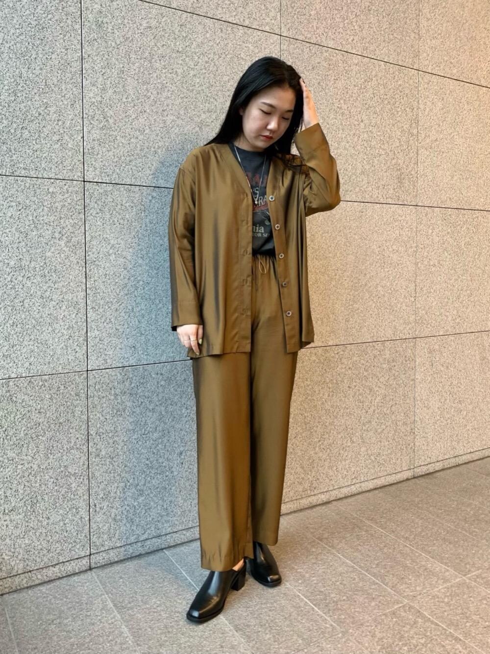 身長162cm 普段サイズ アウターMorL/ボトムスMorL/シューズ24.5cm 【サイズ感】 シャツ:着丈長め(お尻が隠れるくらい)、身幅ゆったり。 パンツ:程よくワイドシルエットのストレート。ウエストゴム。丈長めでヒールと合わせたかったですが、サイズLでも少し短めで、すっきり見える丈感。 【素材感・着心地】 シャツ・パンツ:キュプラとポリエステルの素材で、光沢感が綺麗です。どちらも薄めの柔らかい素材なので、オーバーサイズでもしっかり落ち感があり、シルエットが綺麗にまとまります。素材がとても似ているので、セットアップ風に着用するのもおすすめです。 【コーディネートポイント】 素材の似たシャツとパンツをセットアップ風にスタイリングしてみました。インナーにはピグメントTEEを忍ばせて、素材の掛け合わせで遊びました。全体的にダークトーンで揃えて落ち着かせながら、シューズをサボにする事で、動いた時にかかとや足首がチラッと見えて抜け感が出るようにしました。