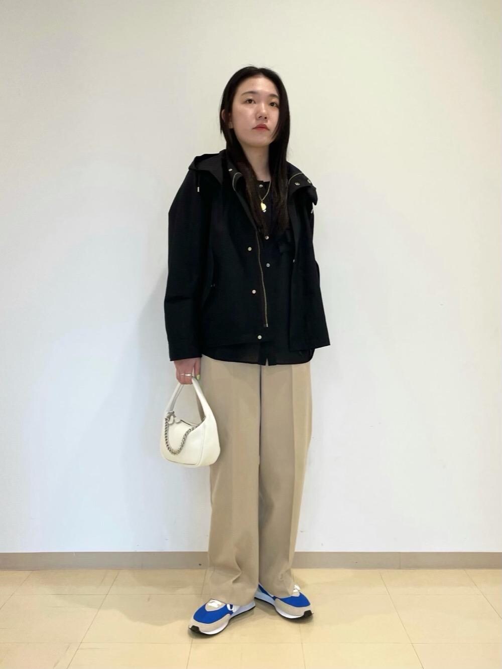 身長162cm 普段サイズ アウターMorL/ボトムスMorL/シューズ24.5cm 【サイズ感】 アウター:身幅ゆったり。着丈短め。3サイズ展開で自分に合うサイズで選んでいただけます。 シャツ:ややゆったり。着丈標準。ワイドパンツに合わせてもバランスが取れる着丈です。 パンツ:ワイドストレートシルエット。ウエストゴムで楽に履いていただけます。 【素材感・着心地】 アウター:コットンナイロンの素材で張りのある風合いです。撥水加工が施されているので汚れも付きにくく、雨の日も使っていただけます。 シャツ:ポリエスとウールの上質な張り感がありながらも、少しシアーな素材で抜け感もあります。 パンツ:ウールライクな質感ながらも、ポリエステル素材でしわが気になりにくく、手洗い可能な利便性を兼ね備えています。 【コーディネートポイント】 ブラックとベージュの合わせでカジュアルな中にも品を感じさせるイメージで。全体のシルエットはラフな印象ですが、素材感で上品さを意識しました。ベーシックなカラーのアイテムを合わせたので、スニーカーにワンポイントになるカラーを合わせました。