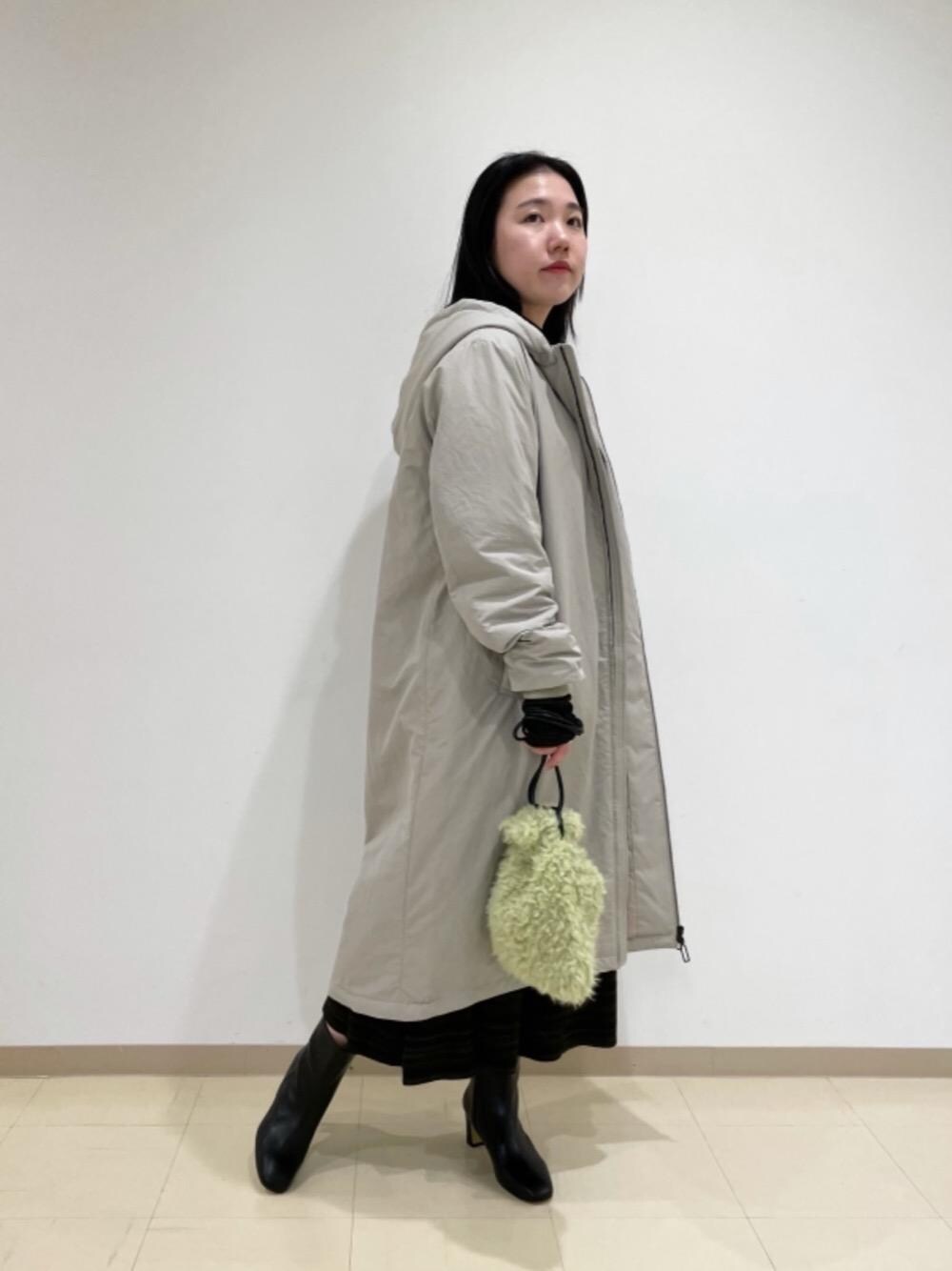 身長162cm 普段サイズ アウターMorL/ボトムスMorL/シューズ24.5cm 【サイズ感】 アウター:ゆったり。 ワンピース:身体にフィットするサイズ。 【素材感・着心地】 アウター:ロングのアウターながらもとても軽く、光沢感も抑えたデイリーユースしやすい素材感です。 ワンピース:ウール混素材で、肌触りも柔らかいです。霞がかったような模様がさりげなく可愛いです。 【コーディネートポイント】 ロングダウンコートにニットワンピースを忍ばせて、小物にはフェイクファーやヒールのブーツをチョイス。カジュアルなアウターにはとことん女性らしいアイテムを合わせて、タウンユース出来るようバランスを意識しました。