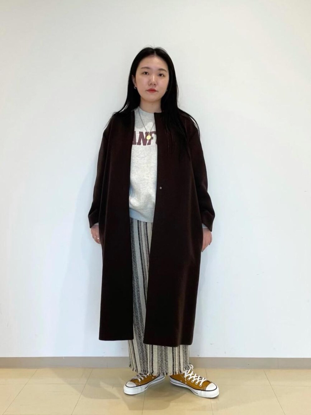身長162cm 普段サイズ アウターMorL/ボトムスMorL/シューズ24.5cm 【サイズ感】 アウター:ややゆとりあり。厚手のニットも着込めるサイズ感。サイズ展開XSからL。 スウェット:身幅ゆったり。裾のリブでコンパクトな着丈のでも着ていただけます。 スカート:すっきりしたIラインシルエット。丈長めで162cmでMサイズ着用で足首くらい。 【素材感・着心地】 アウター:ウール混の素材でソフトな風合いが特徴的な素材。 スウェット:コットン素材。裏起毛ありで暖かく着られます。 スカート:ストライプ柄が目を惹くデザインとウール混の素材感が魅力的。裏地が付いているので着心地良く、履きやすいです。 【コーディネートポイント】 ロゴスウェットとスニーカーにタイトスカート、ノーカラーコートを合わせてカジュアルな中にも少し品を感じさせるスタイリングを意識しました。ノーカラーコートで首回りがすっきり見え、カラーで落ち着いた印象に。 ストライプ柄とスニーカーのマスタードカラーのマッチングが絶妙です。