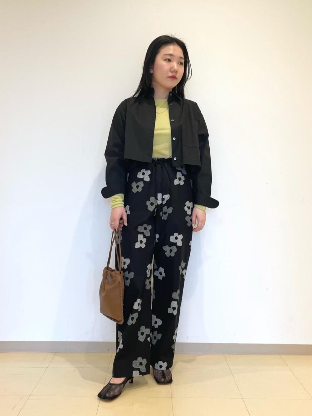 身長162cm 普段サイズ アウターMorL/ボトムスMorL/シューズ24.5cm 【サイズ感】 インナー:標準的 シャツ:着丈短い。身幅ゆったり。 パンツ:ウエストゆったりですが、ドロスト仕様で調節可能。ワイドストレートシルエット。 【素材感・着心地】 インナー:コットンナイロンの透け感のある素材です。 シャツ:コットンに少しポリウレタンが入った高密度のブロード生地です。手洗い可能です。 パンツ:肌触りの良いコットン素材です。 【コーディネートポイント】 <AURALEE>のモノトーンな花柄が目を惹くパンツを主役に、程よくカラーを入れ込みました。シアーのインナーが全体を明るくしてくれます。バッグにはブラウンをチョイスして、イエローのインナーが浮かないようにしました。