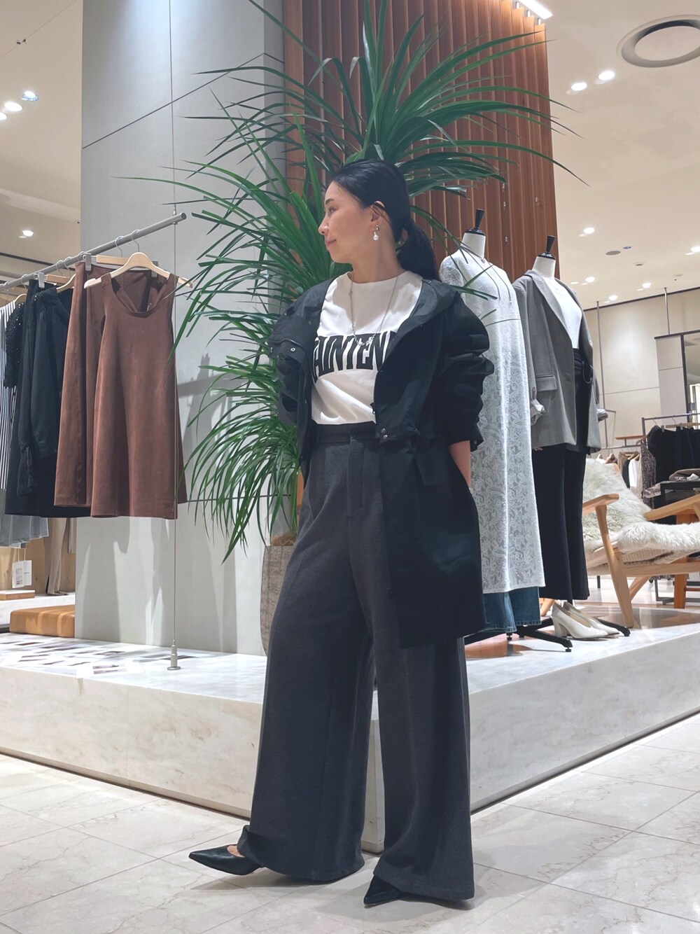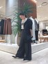 モノトーンで合わせた秋のコーデ。 アウターの中に厚手のニットやインナーダウンを重ねると冬の始まりにも活躍できます。 アウターはウエストのボタンを外すとショート丈になり、裾広がりのボトムスなどにもバランスよく合わせられます。