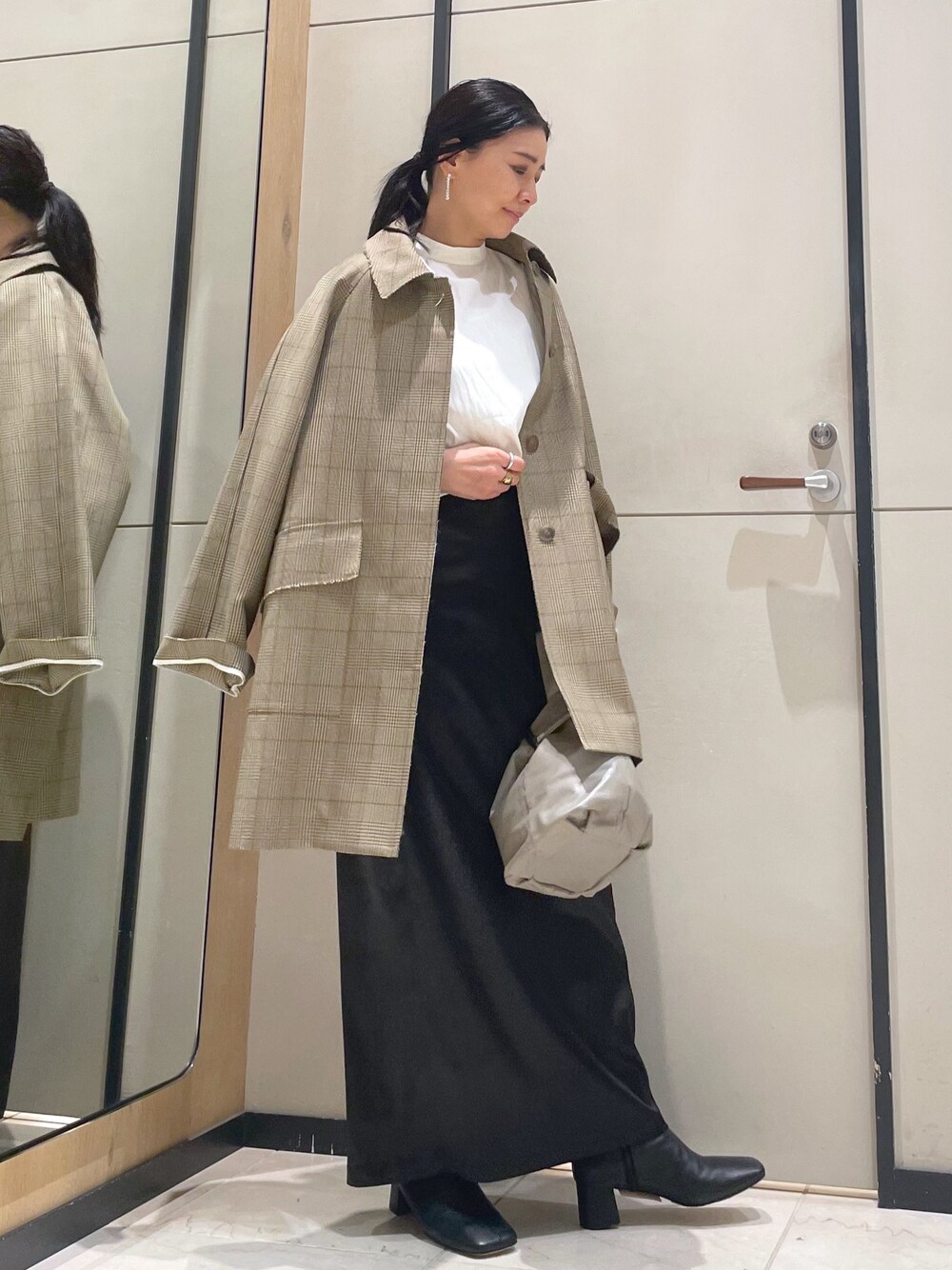 チェックがアクセントになるコートをポイントに綺麗めコーデでまとめました。 サラッと羽織れるコートでありながら存在感がを作る事ができる便利な一枚。