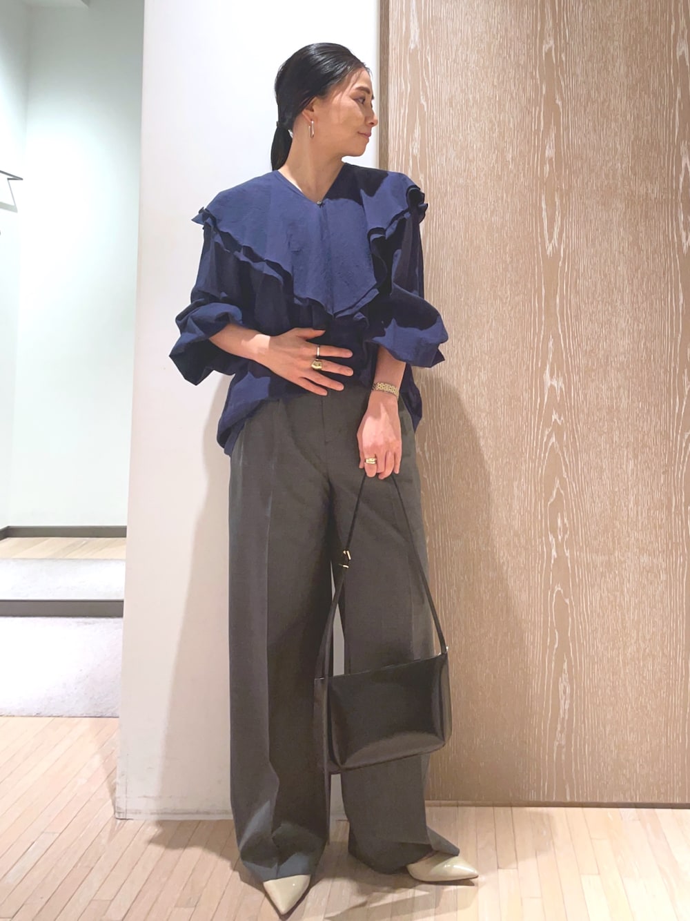【158cm 骨格ウェーブ】 着映えするフリルブラウスをポイントにした大人の綺麗めコーデ。 それぞれオケージョンにも仕事にも万能に使えるアイテムです。