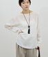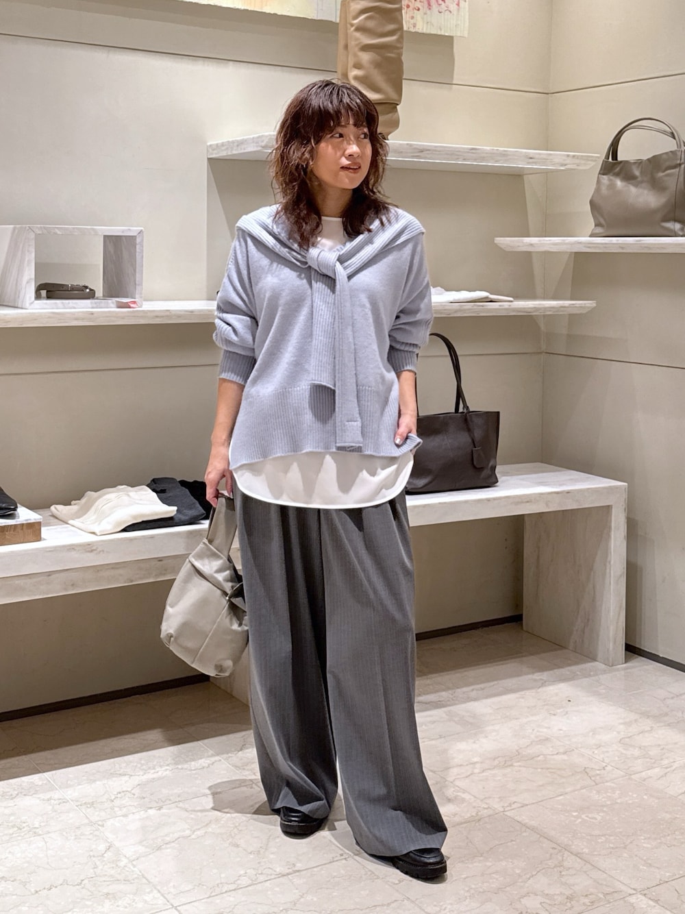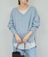 アレンジの効くフード付きニットは明るい水色を選んで、定番のグレーのスラックスを春らしくコーディネートしました。 白いブラウスをレイヤードして垢抜け感のあるコーディネートに。
