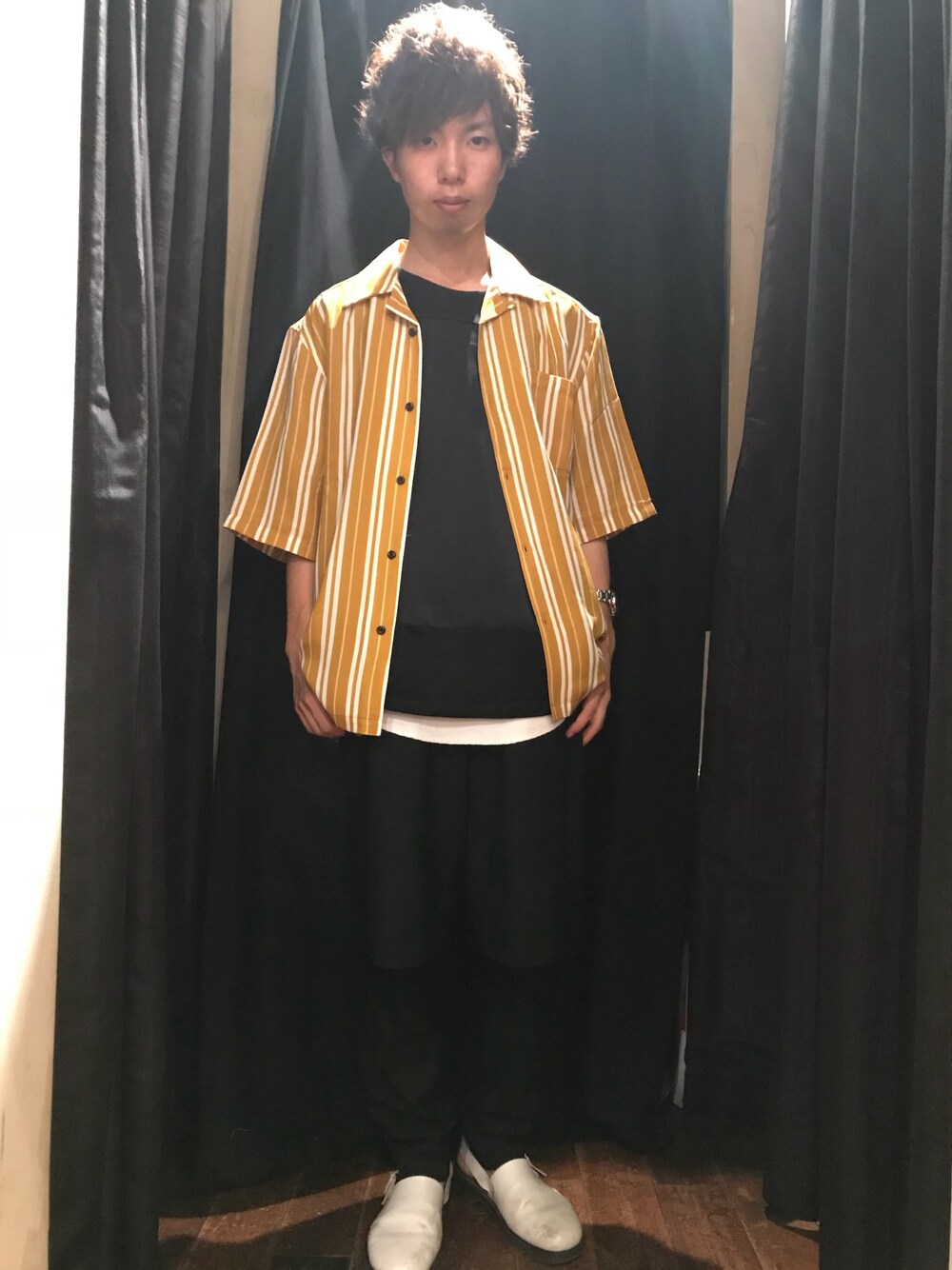 イエロー系のシャツ/ブラウスを着用したメンズの夏コーディネートの1枚目の写真
