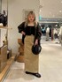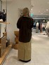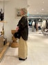 シャツは艶感がありキレイ見えする素材なので、インナー・小物をブラックで統一させシックな印象になるようにしました。